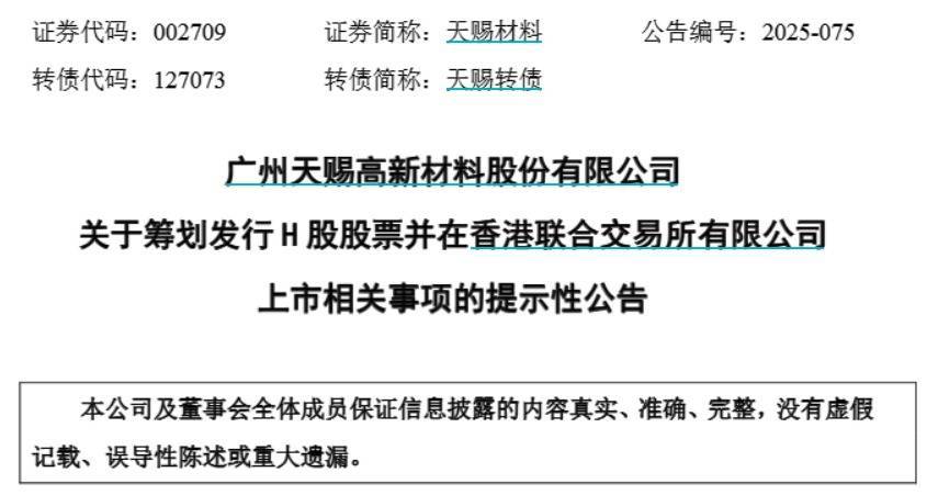 天赐材料称,为深入推进公司全球化战略布局,打造国际化资本运作平台,满足海外业务的持续发展需要和提质增效要求,提升公司在国际市场的综合竞争实力,巩固行业地位,根据相关法律法规的要求,公司计划公开发行H股股票并申请在香港联交所主板挂牌上市。